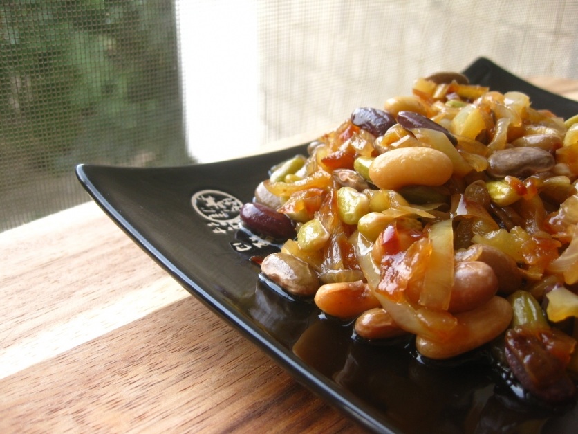 Ингредиенты: 1,5 стакана фасоли 2 сладких перца 1 головка репчатого лука 2 ст.ложки соуса терияки перец. Фасоль замочить на несколько часов в холодной воде, затем слить воду. Снова залить фасоль холодной водой, довести до кипения и варить на маленьком огне до готовности. Перец и лук очистить и нарезать соломкой. Обжарить на сковороде с растительным маслом до румяности, добавить фасоль, влить немного воды , перемешать и протушить пару минут. Затем добавить соус терияки и тщательно перемешать. Снять с огня и дать немного настояться.